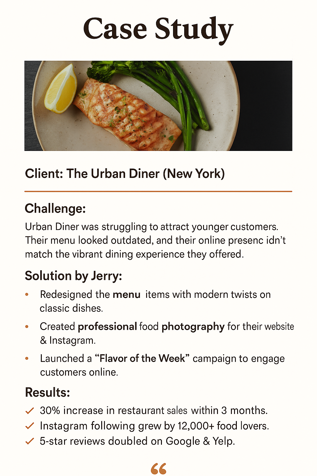 "Jerry brought our restaurant’s menu to life. His recipes are not only delicious but also customer favorites. Sales are up, and reviews have never been better!"